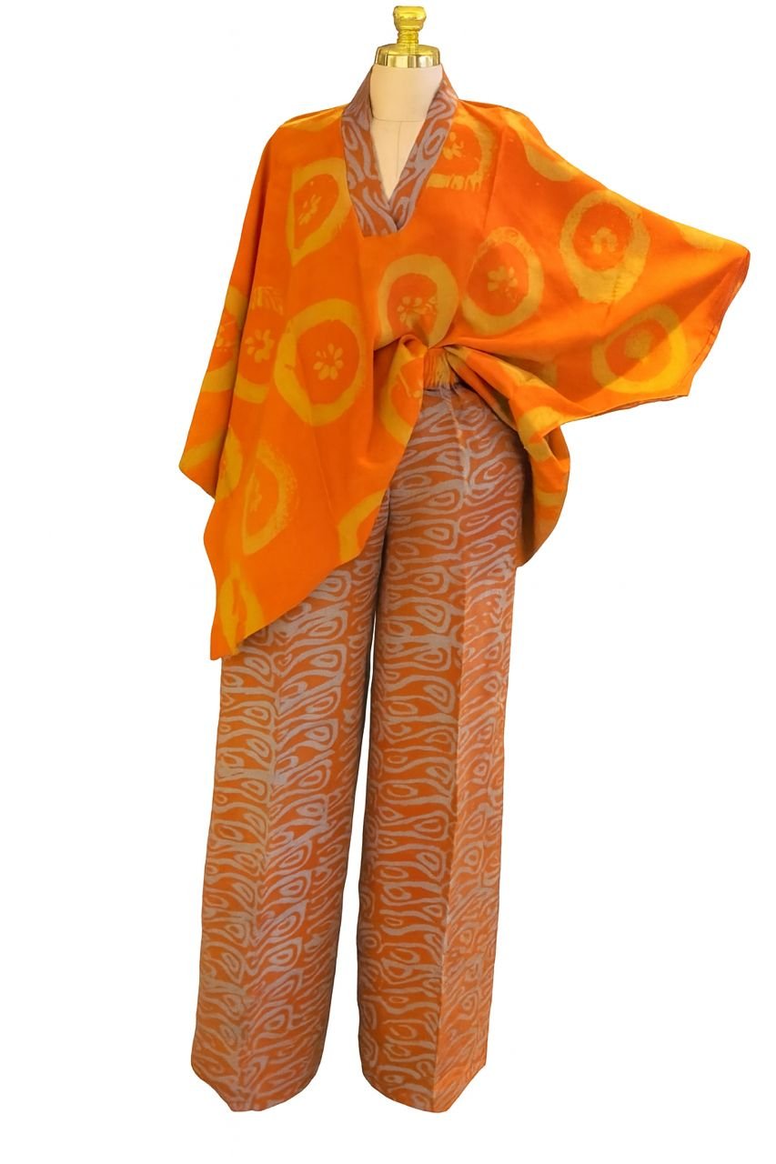 The flowy oversized kimono top features dramatic wide sleeves and a chic side knot, creating a graceful silhouette. Crafted in a vibrant sunset orange, the fabric is adorned with hand-painted style circular motifs in golden yellow, giving the outfit a radiant, uplifting energy.